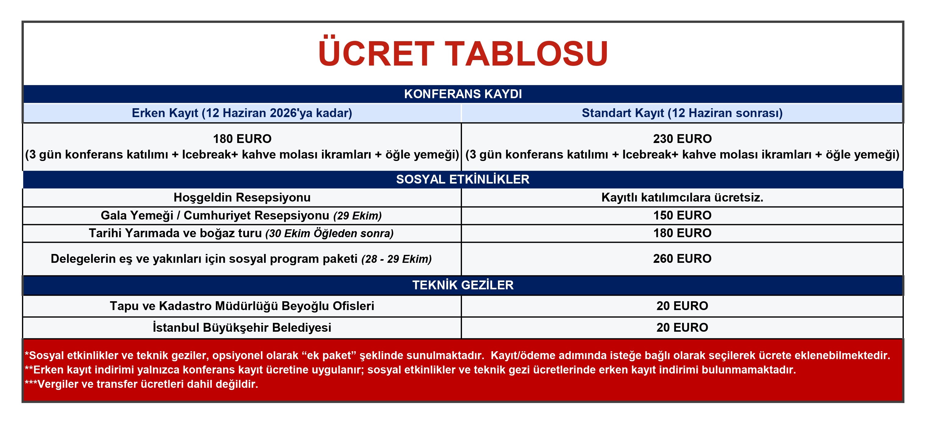 Konferansa katılım için kayıt işleminin tamamlanması ve ilgili katılım ücretinin ödenmesi gerekmektedir. Katılım ücretleri, kayıt dönemine (erken/standart), katılımcı kategorisine ve varsa ek hizmetlere göre değişiklik göstermektedir. Aşağıdaki tabloda ücret kalemleri ve kapsam bilgileri yer almaktadır. Ödeme adımları ve kayıt koşullarına ilişkin ayrıntılar bu sayfa üzerinden paylaşılacaktır.